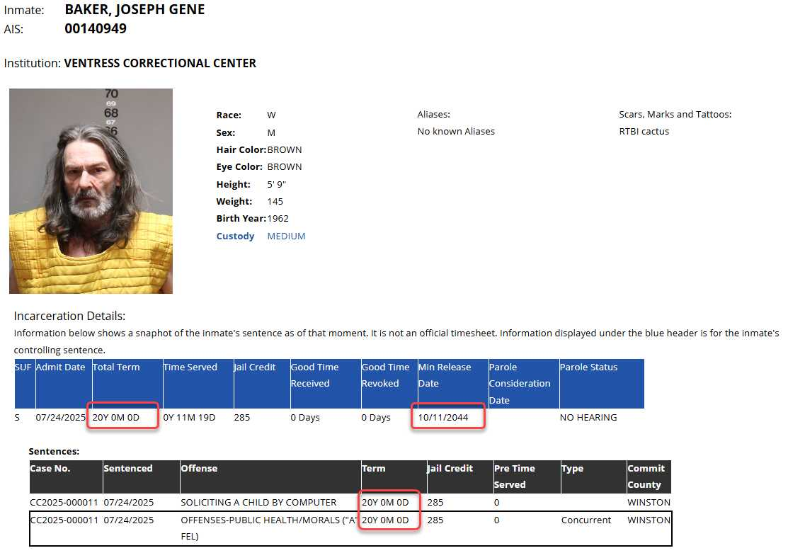 On October 21, 2024, Joe Baker, 62, of Haleyville, Alabama, was arrested for talking sexually with multiple minors. He was interviewed by Boots from Bikers Against Predators and admitted to the conversations.